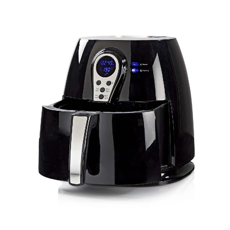 Met deze hete-lucht air fryer bereidt je snel en eenvoudig snacks, vlees en groenten met weinig tot geen vet. Deze air fryer is de perfecte aanvulling op je huidige keukenapparatuur dankzij de 6 programma's waardoor eten bereiden gemakkelijker wordt dan ooit. De heteluchtfriteuse heeft een maximale capaciteit van drie liter, dit staat gelijk aan ongeveer 1 kilogram aan voedsel (afhankelijk van het soort voedsel). De friteuse kan temperaturen bereiken van 80 tot 200 graden Celsius. Door middel van de oververhittingsbeveiliging zal het apparaat niet oververhit raken, zo kun je deze rustig laten werken zonder elke minuut te checken of de friteuse niet te warm wordt. Door de antiaanbaklaag is de airfryer snel en gemakkelijk schoon te maken. De rubberen anti-slip voetjes zorgen er voor dat de airfryer tijdens het koken op zijn plek blijft staan. De air fryer beschikt overigens over een oprolbare ingebouwde stroomkabel, deze neemt weinig plaats in beslag en heeft een maximale lengte van 1 meter. Eigenschappen: - Kleur: Zwart - Lengte van kabel: 1m (meter) - Capaciteit: 3l (liter) - 6 verschillende standen - Met indicatielampjes - Vermogen: 1400 Watt - Tijdschakelaar: 60 minuten - Perfect voor een vetarme levensstijl