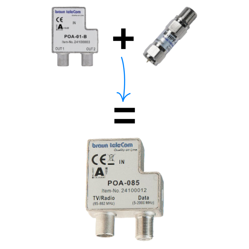 De modempoort is te herkennen aan de vrouwelijke F-connector. De TV poort is ook voor radio geschikt en loopt door tot 862 MHz. De retourband wordt gedempt. De TV/R poort is herkenbaar aan de mannelijke IEC connector. Deze verdeler, ook bekend als POA-085, heeft dezelfde functie als het retourpadfilter. Dit is het voorkomen van het retoursignaal in de TV/R of DAB aansluiting. Als dit signaal niet uitgefilterd wordt, kan dit tot storingen leiden. De toepassing van deze POA-085 verdeler is gelijk aan de toepassing van de POA-01B verdeler plus retour pad filter. Deze verdeler is Ziggo geschikt, maar niet goedgekeurd voor gebruik met KPN.