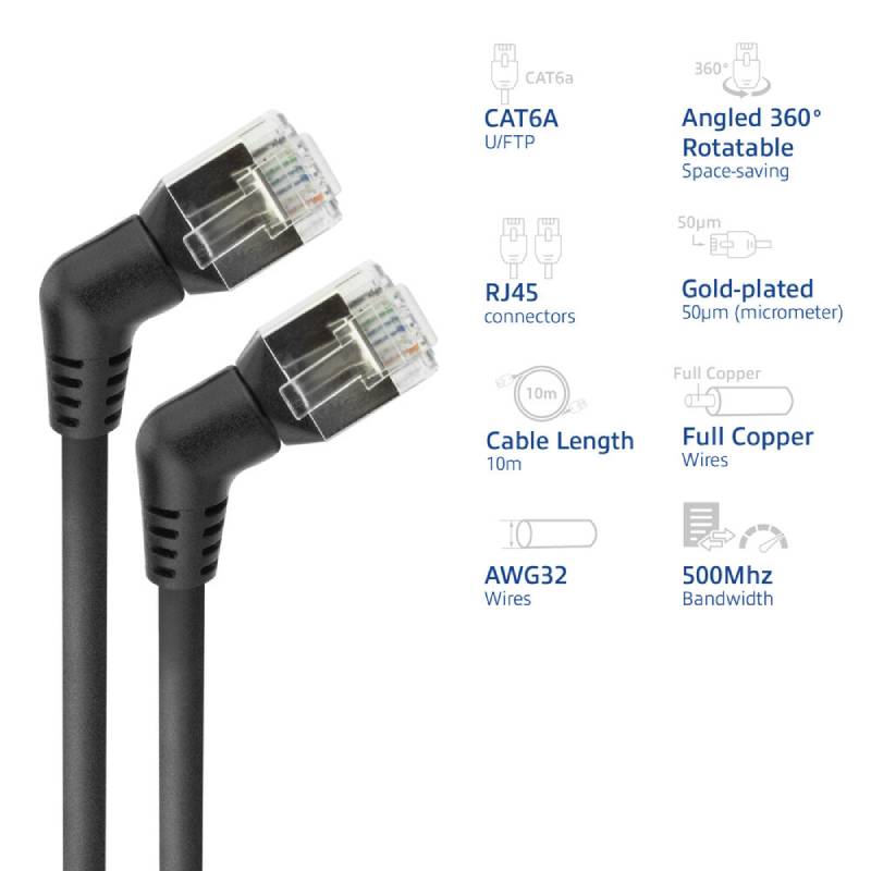 De haakse aansluiting die 360 graden draaibaar is, maakt de kabel extra flexibel en perfect voor in patchkasten, waar er weinig ruimte is en extra flexibiliteit gewenst is. De kabel is slechts 4mm in omtrek (diameter) en is daarmee extreem dun. Dit zorgt voor plaats besparing, extra flexibiliteit en een betere luchtstroom in bijvoorbeeld een netwerkkast.
