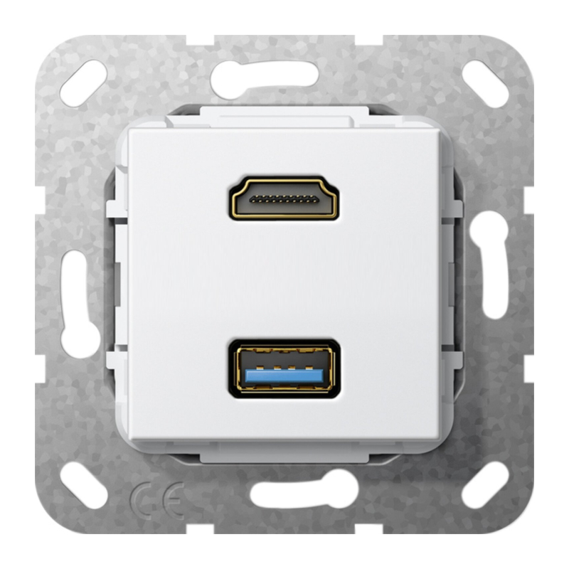 Het basiselement is geschikt voor HDMI en USB, 2-voudig uitgevoerd en ontworpen voor inbouwmontage. Dankzij de draagring en schroefbevestiging zit het geheel stevig en betrouwbaar in de muur. De afwerking in glanzend wit (RAL 9010) sluit naadloos aan bij ander Gira schakelmateriaal.