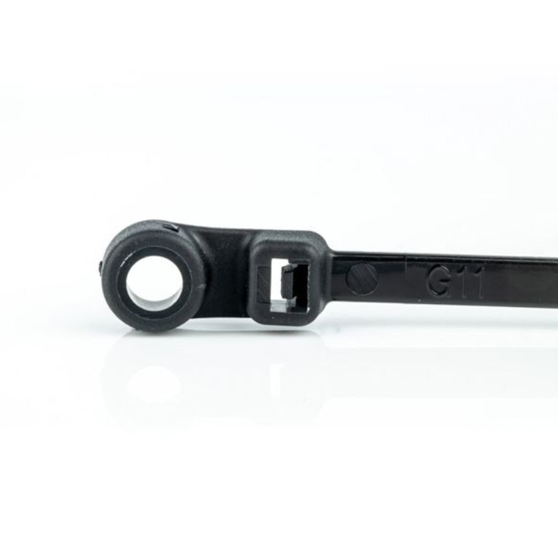 Elke kabelbinder is uitgerust met een bevestigingsoog van 5,2 mm, waardoor je ze gemakkelijk kunt bevestigen aan haken, schroeven of andere bevestigingspunten. Hierdoor kun je kabels veilig vastzetten en ze op hun plaats houden, zelfs bij blootstelling aan de elementen.