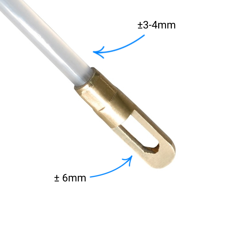 Dit is dus ook de minimale diameter van de buis die je nodig hebt om de trekveer te kunnen gebruiken. De opening in het oog van de trekveer is 7 x 3,5 millimeter. De buitenkant van de trekveer is afgewerkt met nylon, de diameter van de trekveer is tussen de 3 en 4 millimeter.