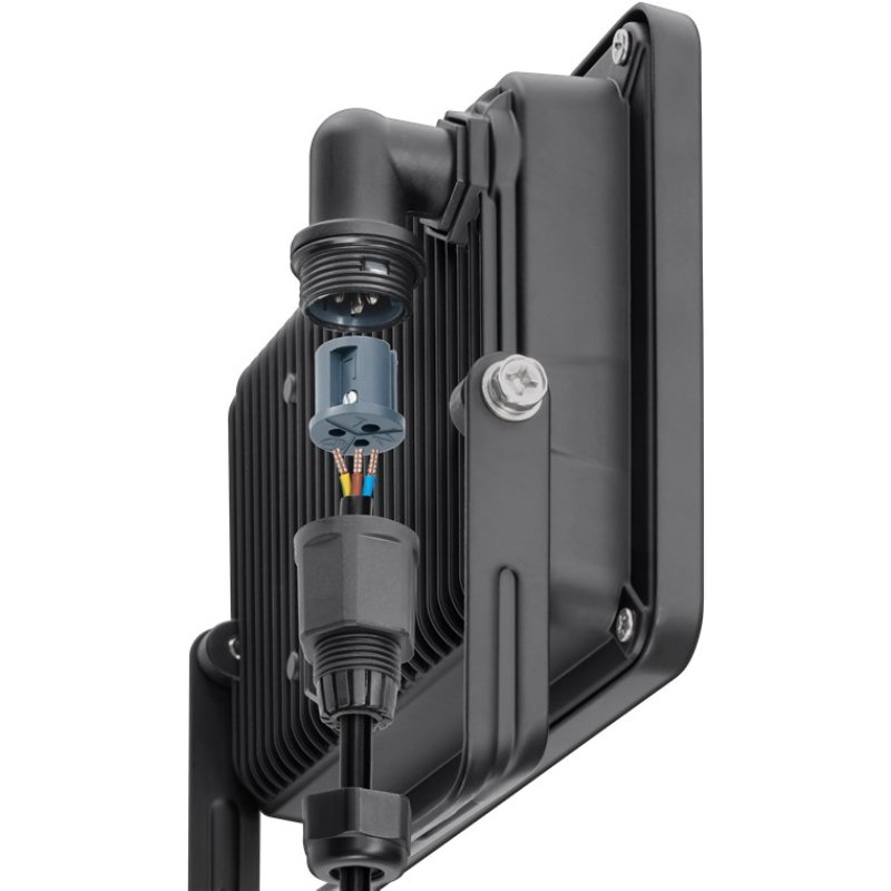 De LED Schijnwerper werkt op 230V. Let op, bij deze schijnwerper kun je zelf een omhulde kabel met een diameter van 4 – 10 mm doorvoeren en aansluiten.