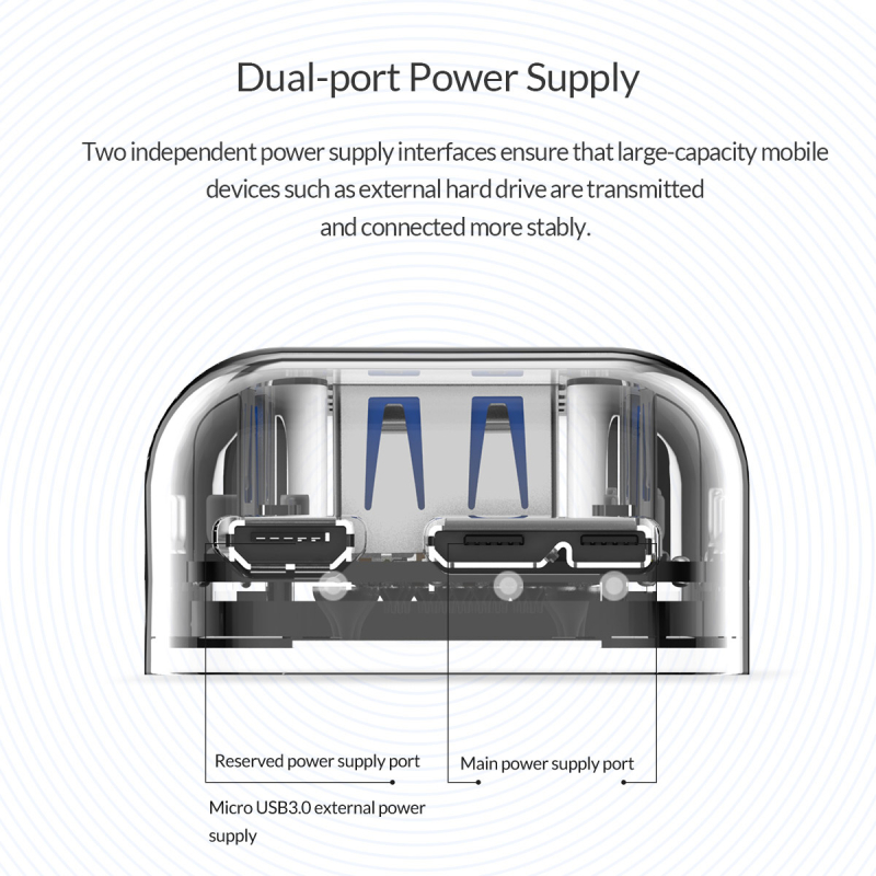 De USB 3.0 poorten maken dataoverdracht met wel 5 Gbit/s mogelijk, de hub is ook geschikt voor gebruik in combinatie met 2.0 apparaten, de maximale snelheid is dan 480 Mbit/s. Dankzij de LED verlichting weet je precies wanneer de hub in gebruik is, de onderkant van de hub licht blauw op wanneer de hub aangesloten is. De extra USB Micro B poort is bedoeld om een extra kabel aan te sluiten waarmee je de hub kunt voeden. De micro USB kabel zorgt dan voor extra stroom, zodat je de hub ook kunt gebruiken in combinatie met zwaardere apparaten die meer stroom vereisen. Soms is bus voeding (voeding via de USB poort) namelijk niet voldoende voor bijvoorbeeld een grote harde schijf.