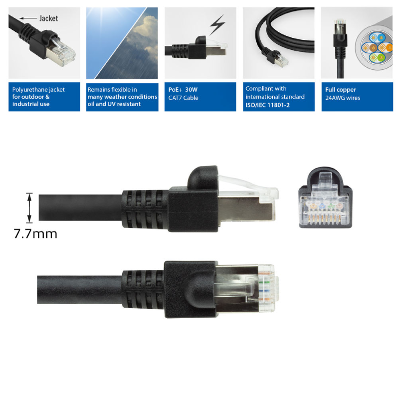 Een Cat 7 aansluiting kan gebruikt worden in netwerken met snelheden tot wel 10 Gbit/s, deze netwerken heten ook wel gigabit netwerken (GBIT). De bandbreedte van een 7 aansluiting is 1 GHz, oftewel 1000 MHz. Bandbreedte is te vergelijken met een snelweg, hoe meer rijbanen, hoe meer auto’s er tegelijkertijd verplaatst kunnen worden. Hoe hoger de bandbreedte, hoe meer data. Cat 7 kabels kunnen vaak ook gebruikt worden in Cat6a, Cat6 of Cat5 netwerken, enkel is de maximale snelheid dan die van de aansluiting met de laagste categorie in het netwerk.