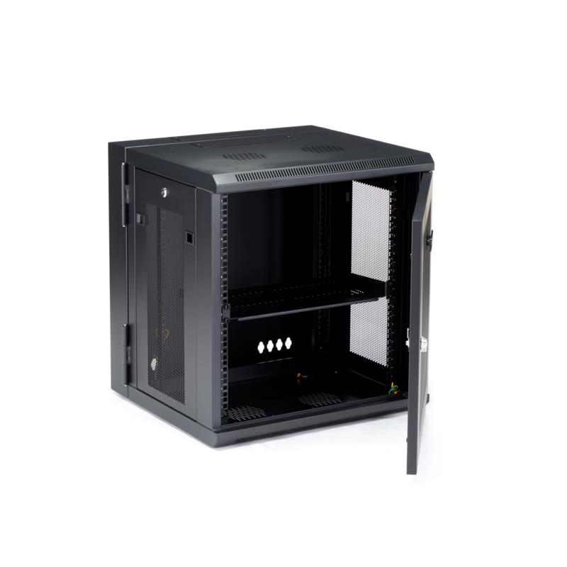 Met deze 12U server- of netwerk rack kast kunt u uw EIA-310 conforme apparatuur aan de wand monteren, in een veilige behuizing met een scharnierdeur aan de achterkant voor eenvoudige toegang tot uw apparatuur. De behuizing heeft een verstelbare montagediepte van 5 tot 40,6 cm voor een robuuste opslagoplossing voor uw rackgemonteerde apparatuur.